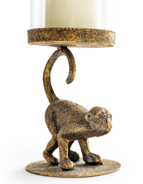 A beautifully vintage style pillar candle holder with a glass sleeve, this antique gold monkey design will suit a variety of home interiors.